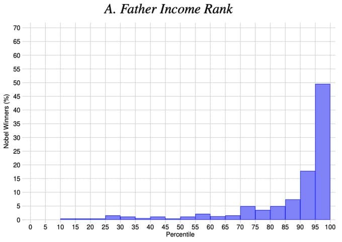 نتایج پژوهشی تازه درباره پیشینه اقتصادی برندگان جایزه نوبل نشان میدهد بیشتر آنان از خانوادههای ثروتمند برخاستهاند و هنوز فرصت برابر برای افراد با پیشینه متوسط یا فقیر در علوم وجود ندارد. بررسی دادههای ۷۳۹ برنده نوبل بین سالهای ۱۹۰۱ تا ۲۰۲۳ میلادی نشان داد که میانگین درآمد خانوادههای آنان در صدک ۸۷ جامعه بوده است، هرچند نسبت به آغاز قرن بیستم اندکی بهبود یافته است.